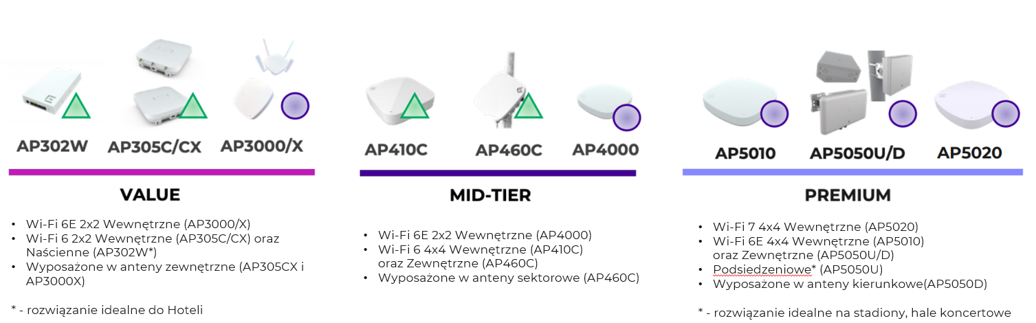 Punkty dostępowe Extreme Networks to zaawansowane urządzenia, które zapewniają łączność bezprzewodową najwyższej klasy. Są one wyposażone w technologie od Wi-Fi 6, przez Wi-Fi 6E i Wi-Fi 7, działając we wszystkich trzech pasmach częstotliwości: 6 GHz, 5 GHz i 2,4 GHz. Punkty dostępowe Extreme Networks są zdolne do obsługi wielu systemów operacyjnych dla zarządzania lokalnego i/lub w chmurze. Są one w pełni funkcjonalne przy użyciu zasilania PoE.